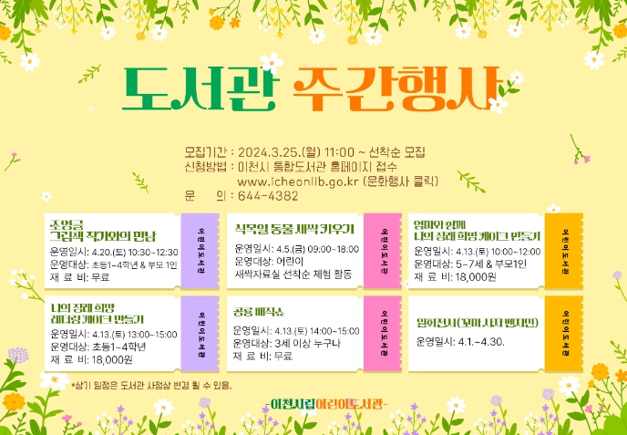 한편 이천시장은 "도서관 주간을 맞아 준비한 다채로운 프로그램 행사를 통해 시민들이 도서관을 찾는 즐거움을 느끼고, 지역사회에 책 읽는 문화가 확산되기를 바란다 "고 전했다.