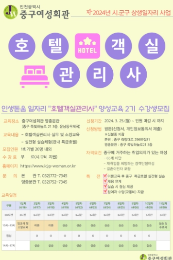 [뉴스서치] 인천 중구여성회관은 ‘호텔객실관리사 양성 교육’ 2기 교육생을 모집한다고 25일 밝혔다.