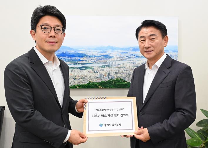 ▲ 김동근 시장이 7월 18일 서울시청을 방문해 김병민 서울시 정무부시장에게 106번 버스 폐선 철회 건의서를 전달하고 있다. |