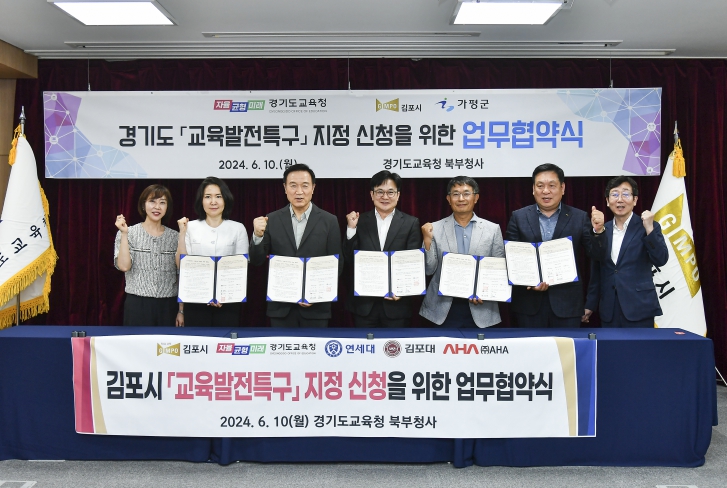 ▲ 교육발전특구 시범사업 운영 업무협약후 기념사진 왼쪽부터 서혜정(경기도교육청 정책기획담당관), 박진영(김포대학교 총장) 임태희(경기도 교육감), 김병수(김포시장), 이남규(연세대 산학교육분과장) 구기도 (㈜AHA 대표), 이창우(김포시 교육지원과장) |