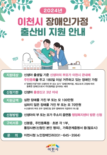 [뉴스서치] 이천시는 2024년 6월부터 이천시 장애인가정에 출산비를 지원한다고 밝혔다.