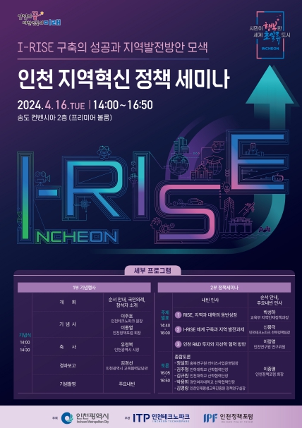 [뉴스서치] 인천테크노파크(인천TP)와 인천시는 인천형 RISE 체계의 성공적인 구축과 지역발전방안을 모색하기 위해 오는 16일 송도 컨벤시아에서 (사)인천정책포럼 및 지역대학과 함께하는 정책 세미나를 개최한다고 밝혔다.