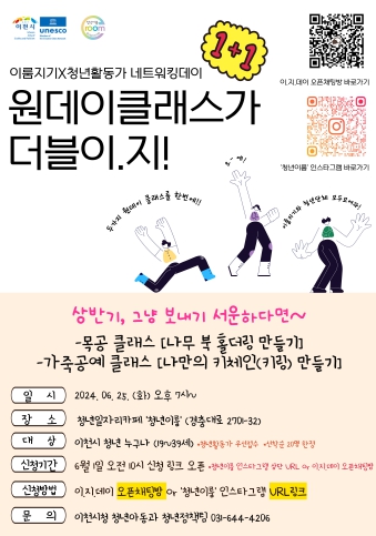 목공(나무 북 홀더링 만들기) 및 가죽공예(나만의 키링 만들기) 체험과 함께 2024년 상반기를 마무리하며 소감을 나누는 본 과정은 6월 1일부터 이.지.데이 오픈채팅방 및 청년이룸 인스타그램 URL링크를 통해 신청할 수 있다.