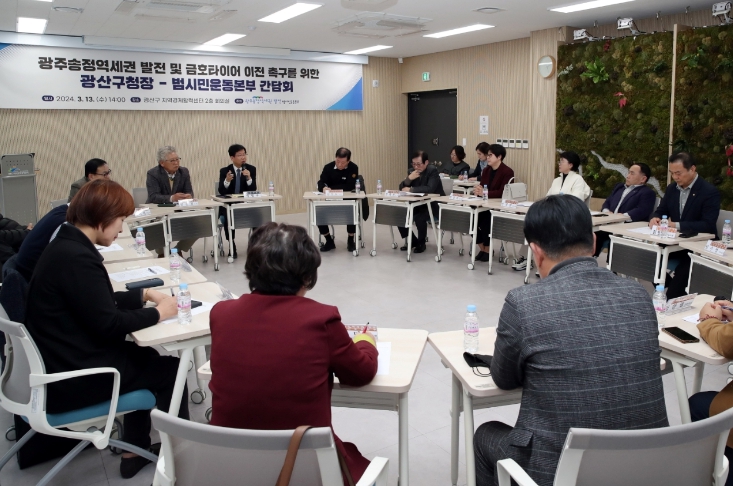 [뉴스서치] 광주송정역세권 발전 범시민운동본부(공동대표 : 임한필․전창현, 이하 범시민운동본부)는 13일에 광산구지역경제활력센터 2층 회의실에서 ‘광주송정역세권 발전 및 금호타이어 이전 촉구를 위한 광산구청장-범시민운동본부 간담회’를 범시민운동본부 임원 및 시민 30여명이 참가한 가운데 개최했다.