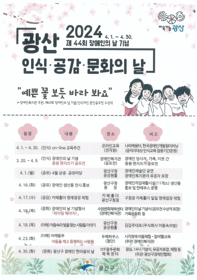 광산구는 올해 장애인의 날 주간 인식개선 운동표어로 ‘예쁜 꽃 보듯 바라 봐요’를 정하고, 장애에 대한 이해를 넓히고 차별과 편견을 해소하는 장을 마련한다.