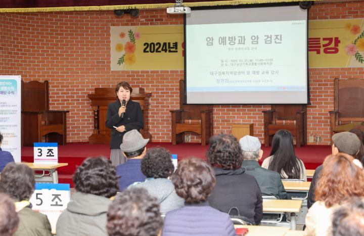 [뉴스서치] 대구 중구는 제17회 암 예방의 날인 지난 21일을 기념해, 25일 남산기독교종합사회복지관에서 어르신 50여 명을 대상으로 암 예방 및 검진 특강을 진행했다.