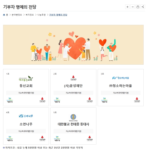 기부자 예우를 위해 ‘기부자 명예의 전당’에는 누계 5천만원 이상 또는 최근 3년간 2천만원 이상 현금을 기부한 5인의 명단을 등재한다.