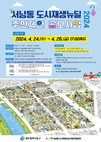 [뉴스서치] 광주 동구는 주민들의 적극적인 관심과 참여를 바탕으로 지역공동체를 활성화하고, 지속 가능한 도시재생 사업 기반을 마련하고자 ‘서남동 도시재생뉴딜 주민제안 공모사업’을 진행한다고 밝혔다.