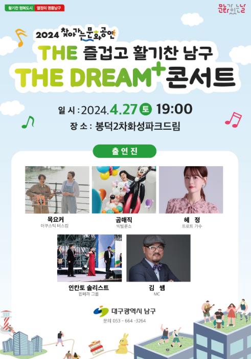 지난 달 남구 관내 공동주택을 대상으로 공연을 희망하는 아파트 단지를 모집하여 최종 7개 단지를 선정하였고 4월 27일 봉덕2차 화성파크드림아파트에서 첫 공연을 진행할 예정이다