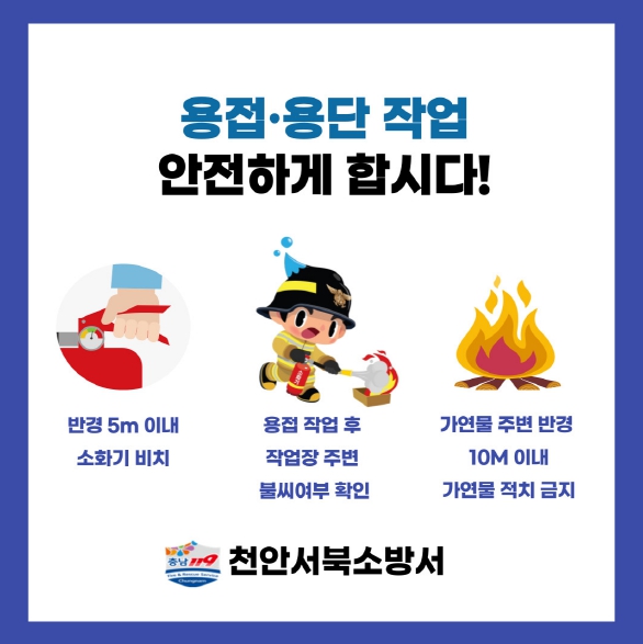 [뉴스서치] 천안서북소방서는 용접·용단 작업 등 화기 취급 과정에서 발생할 수 있는 화재를 예방하기 위해 공사장 화재 안전 수칙 준수를 당부한다고 전했다.