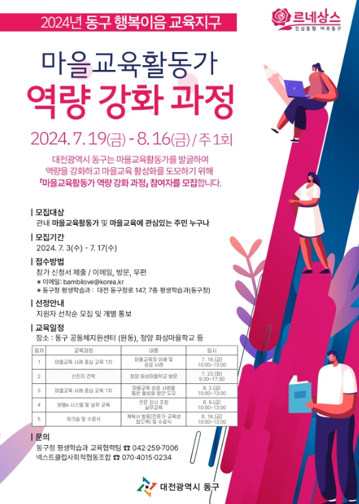 [뉴스서치] 대전 동구는 2024년 동구 행복이음 교육지구 ‘마을교육활동가 역량 강화 과정’ 참여자를 이달 18일까지 모집한다.