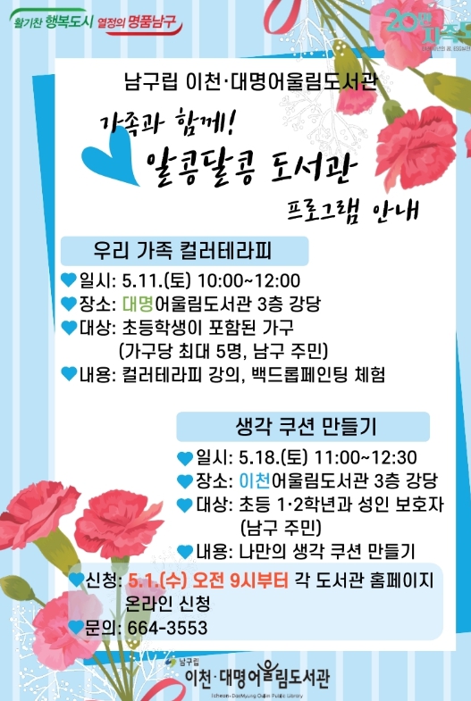 조재구 남구청장은 “주민들이 가정의 달에 가족 단위로 도서관을 방문하여 독서와 함께 문화 프로그램을 즐기고 유익한 여가 시간을 보내기를 바란다.”며 “앞으로도 주민의 요구를 반영한 다양한 문화 프로그램을 개발하겠다.”고 말했다.