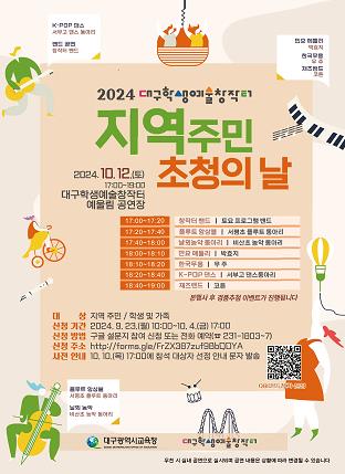 [뉴스서치] 대구시교육청 산하 대구학생예술창작터는 10월 12일 오후 5시부터 창작터 예울림 공연장에서 ‘제3회 지역주민 초청의 날’행사를 운영한다.