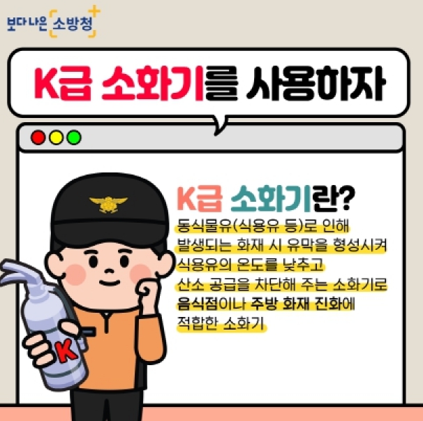 김상식 소방서장은 “식용유를 이용해 음식물 조리를 하는 음식점 주방에는 화재 시 신속한 대응을 위해 K급 소화기 비치를 당부드린다.”고 말했다.