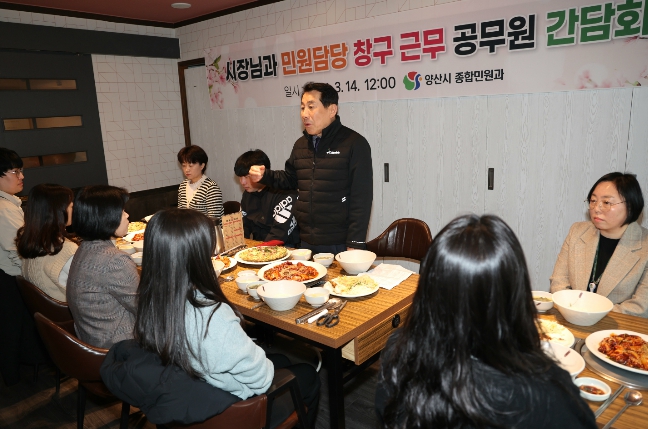 [뉴스서치] 양산시는 14일 관내 음식점에서 나동연 양산시장과 민원창구 담당공무원과의 간담회를 갖고 행정의 최일선에서 근무하는 민원담당 공무원들과 다양한 의견을 공유하는 소통의 시간을 가졌다.