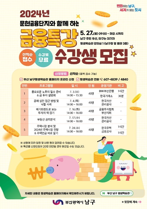[뉴스서치] 부산 남구는 2024년‘문현금융단지와 함께 하는 금융특강’을 남구민을 대상으로 5월 27일부터 모집한다.