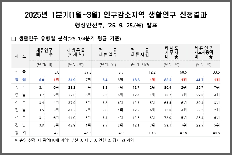 [뉴스서치] 강원특별자치도는 행정안전부가 9월 25일 발표한 ‘2025년 1분기 인구감소지역 생활인구 산정 결과’에서 체류인구 총 2,826,012명으로 전국 최고 수준을 기록했다고 밝혔다.
