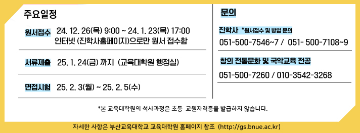 [뉴스서치] 부산교육대학교 교육대학원이 창의적 전통문화 교육과 국악교육의 미래를 이끌어갈 인재 양성을 위해 ‘창의전통문화 및 국악교육전공’ 신입생 모집을 실시한다.