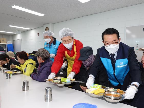 이날 이 시장은 나주영 포항상공회의소 회장, 전익현 포항철강관리공단 이사장과 함께 급식 봉사활동에 참여해 지역 내 취약계층 200여 명에게 사랑이 담긴 식사 한 끼를 제공했다.