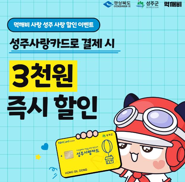이번 행사는 지역화폐인 성주사랑카드와 연계한 할인 이벤트로, 먹깨비 앱을 통해 성주사랑카드로 12,000원 이상 주문 결제 시 3,000원 할인쿠폰이 제공되며, 성주 군민 누구나 매일 1인 1회의 혜택을 받을 수 있다.