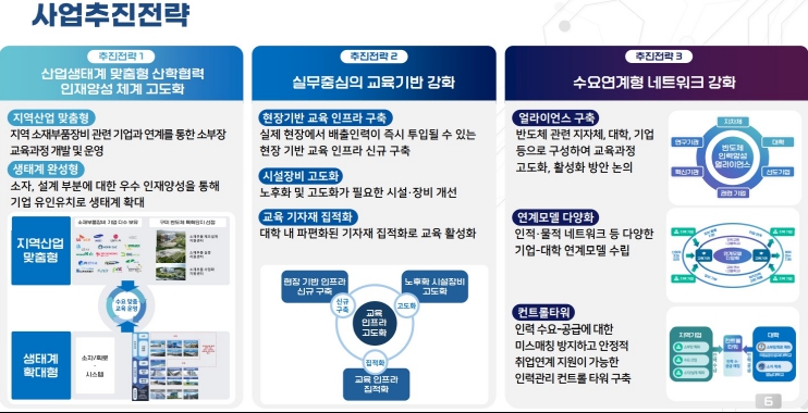 지역기업 수요를 기반으로 △특성화 교육과정 개발과 운영 △교육 및 실습환경 구축 △반도체 분야 취업・진학(대학원) 활성화 등 산학 일체형 소재・부품 인력 양성 생태계 구축이 핵심이며, 4년간 1,500명의 인재 양성을 위한 국비 280억 원을 지원받는다.
