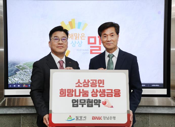이날 협약에서 안병구 밀양시장과 허종구 BNK경남은행 본부장은 소상공인에게 실질적인 도움이 될 대출 지원을 위한 협약을 체결하고, 금융 취약계층의 고충 해소 및 자생력 강화를 위해 협력하기로 했다.