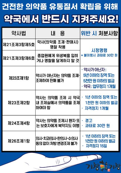 또한 ‘종업원 위생복 및 명찰 착용 행위’는 시정명령 후 불이행 시 30만 원의 과태료가 부과되며, ‘조제실 외 의약품 조제 행위’는 1년 이하의 징역 또는 1천만 원 이하의 벌금이 부과된다.