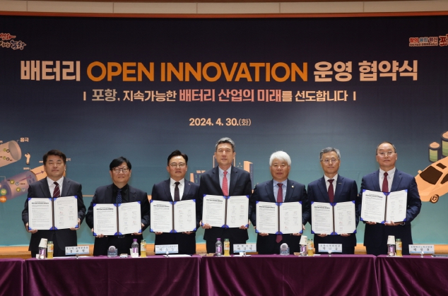 포항시는 30일 포항시청 대회의실에서 SK에코플랜트㈜, 포스텍, 포항테크노파크, 포항금속소재산업진흥원, 경기창조경제혁신센터 등과 지속가능한 배터리 리사이클링 산업생태계 조성을 위한 ‘배터리 오픈 이노베이션 프로그램 운영 업무협약식’을 개최했다.
