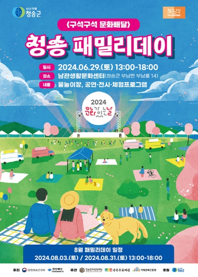 [뉴스서치] 청송군과 청송문화관광재단은 ‘문화가 있는날-구석구석 문화배달’ 사업의 일환으로 청송 패밀리데이를 6월 29일 남관생활문화센터(청송군 부남면 부남로 14)에서 개최한다.