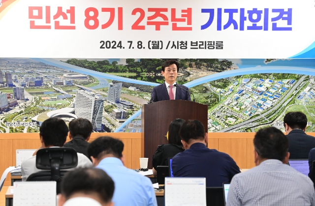 [뉴스서치] 조규일 진주시장은 8일 시청 2층 브리핑룸에서 민선 8기 취임 2주년 기자회견을 열고, 지난 2년 동안의 소회와 앞으로의 계획을 밝혔다.