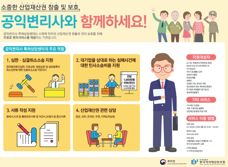 한편, 공익변리사 특허상담센터 지원대상, 지원내용 및 절차 등에 대한 자세한 사항은 공익변리사 특허상담센터 누리집에서 확인할 수 있으며, 공익변리사 특허상담센터로 문의하면 된다.