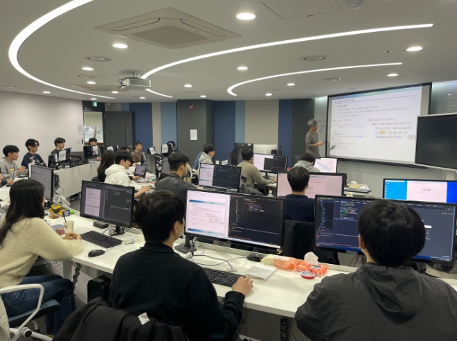 ▲ 한국폴리텍대학 광명융합기술교육원 ‘하나금융티아이 협약반’ 훈련생들이 소프트웨어 개발 실습을 하고 있다.