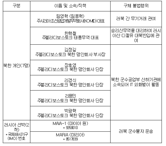[뉴스서치] 우리 정부는 안보리 제재를 위반하여 러북 간 군수물자 운송 및 무기거래, 대북 정제유 반입, 북한 해외노동자 외화벌이 등을 통해 북한 핵ㆍ미사일 개발 물자 및 자금 조달에 관여한 북한 개인 7명 및 러시아 선박 2척을 5월 24일 대북 독자제재 대상으로 지정했다.