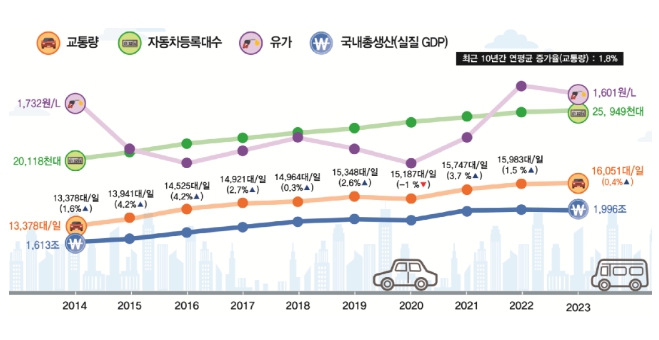’23년 고속국도, 일반국도, 지방도의 평균 일교통량은 16,051대로 전년 대비 0.4% 증가했다. 최근 10년간(’14~‘23년) 연평균 증가율은 약 1.8%로 증가 추세를 보이고 있다.