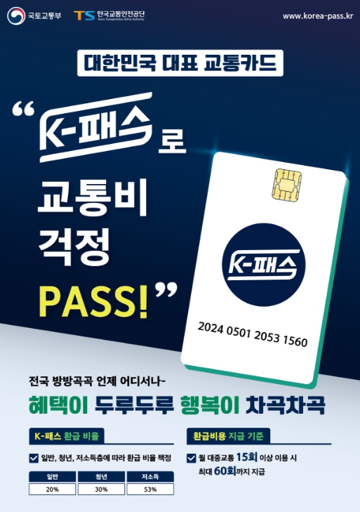 K-패스는 월 15회 이상 정기적으로 대중교통(시내·마을버스, 지하철, 광역버스, GTX 대상)을 이용할 경우 지출금액의 일정비율(일반인 20%, 청년층 30%, 저소득층 53.3%)을 다음 달에 돌려받을 수 있는 교통카드이다.