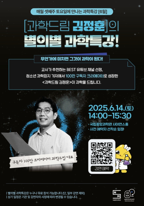 [뉴스서치] 과학기술정보통신부 국립중앙과학관은 매월 셋째 주 토요일에 개최하는 ‘별의별 과학특강’의 6월 연사로 인기 과학 유튜버 ‘과학드림’의 운영자 김정훈 대표를 초청해 강연을 개최한다고 밝혔다.