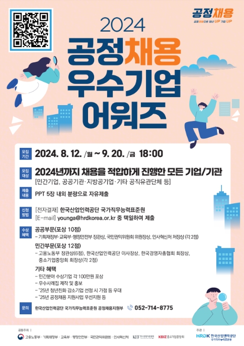 [뉴스서치] 고용노동부와 한국산업인력공단은 “공정채용 우수기업 어워즈(구 ‘공정채용 우수사례 경진대회’)”를 개최하여 8월 12일부터 9월 20일까지 기업과 공공기관의 선도적인 채용 사례를 모집한다고 밝혔다.