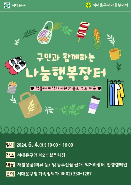 [뉴스서치] 서대문구가 지속가능한 자원 순환과 지역 내 나눔문화 확산을 위해 6월 4일 오전 10시부터 오후 4시까지 서대문 홍제폭포 광장에서 ‘나눔행복장터’를 개최한다.