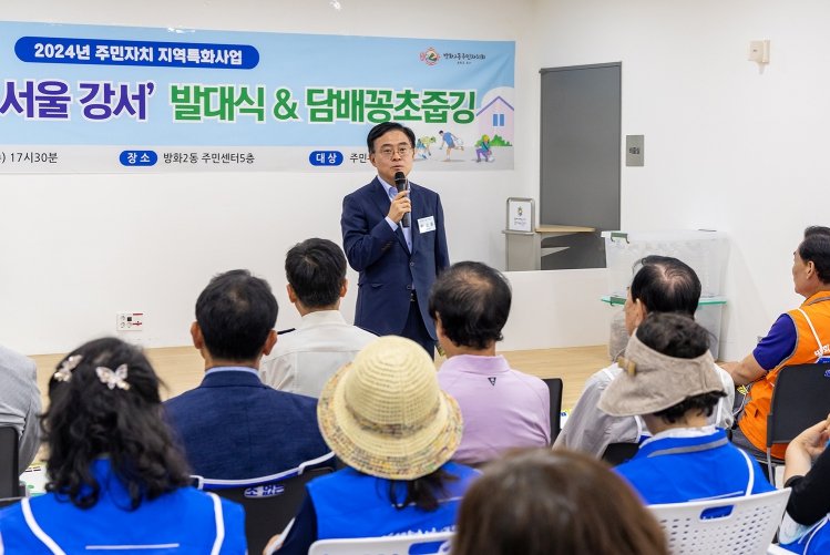 ▲ 진교훈 강서구청장이 방화2동 주민센터 다목적실에서 열린 ‘담배꽁초 줍깅 발대식’에서 인사말을 하고 있다. |