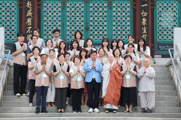 ▲ 박강수 마포구청장과 마포구 직원들이 석불사 템플스테이 프로그램에 참여해 기념촬영을 하고 있다. |