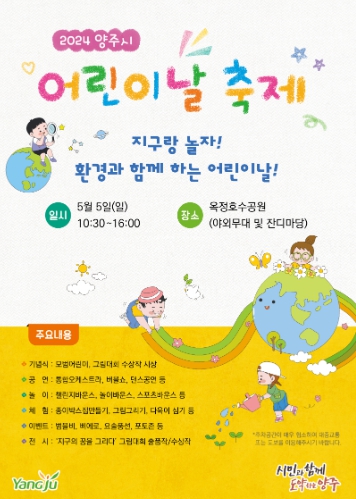 [뉴스서치] 양주시는 어린이날인 5일 오전 10시 반부터 오후 4시까지 옥정호수공원에서 ‘지구야 놀자, 환경과 함께하는 어린이날’을 주제로 ‘양주시 어린이날 축제’를 개최한다고 밝혔다.