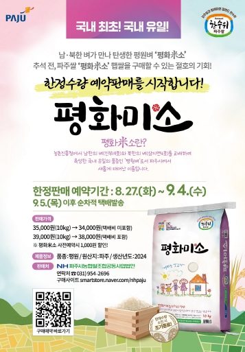 [뉴스서치] 파주시가 국내 최초 남북 교배 품종인 평원벼를 파주쌀 ‘평화미소’로 상품화해 올 추석 햅쌀로 선보인다. 파주시 농협쌀조합공동사업법인은 온라인 판매처를 통해 4일까지 사전예약을 받아, 5일부터 순차 발송할 예정이다.
