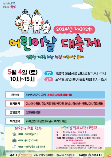 이번 어린이날 대축제는 미래 대한민국의 주역이 될 어린이에게 꿈과 희망을 선물하고자 기획됐다. 하남시가 주최하는 1부 행사와 하남문화재단·제27회하남얘들아놀자추진위원회 주최 및 하남시 후원인 2부 행사로 나뉘어 진행된다.