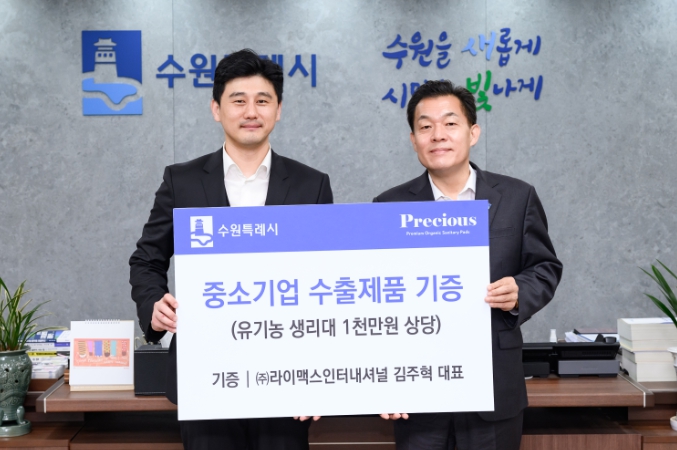 ㈜라이맥스 인터내셔널 김주혁 대표는 13일 수원시청을 방문해 이재준 수원시장에게 자사 생산 제품인 ‘프레셔스 유기농 생리대’ 2700개를 전달했다.