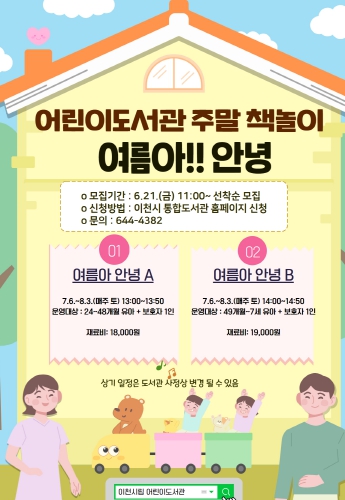 특히 이번 북스타트 주말 책놀이 '여름아! 안녕' 프로그램은 평일에 도서관에 오기 어려운 유아와 양육자를 위해 24~48개월 반과 49개월~7세 반으로 나누어 7월 6일부터 8월 3일까지 매주 토요일 13시부터 15시까지 운영한다.