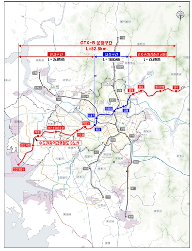 GTX-B노선은 수도권 주요 거점역을 30분대로 연결하는 광역급행철도로 인천 송도국제도시에서 출발해 인천시청, 부평, 서울 등을 경유하고, 남양주 마석까지 연결하는 전체 길이 82.8㎞, 정거장 14개소가 건설된다.