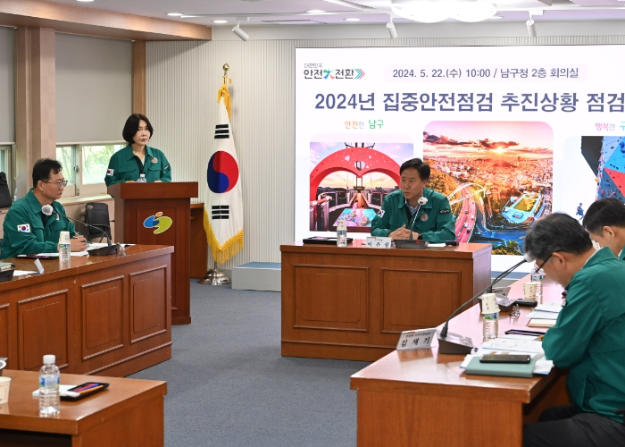 [뉴스서치] 대구 남구는 지난 22일 이유실 부구청장 주재로 구청 2층 회의실에서 관련 부서장이 참석한 가운데 ‘대한민국 안전大전환, 2024년 집중안전점검’의 추진상황을 점검하기 위한 회의를 개최했다고 밝혔다.