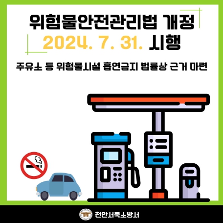 [뉴스서치] 천안서북소방서는 ‘위험물안전관리법’이 개정됨에 따라 주유소 등 위험물 취급 장소에서의 흡연 금지와 금연구역을 알리는 표지판 설치를 당부한다고 전했다.