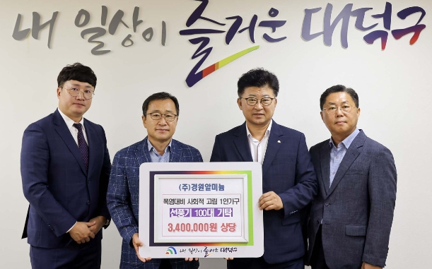 [뉴스서치] 대전 대덕구는 24일 (주)경원알미늄(대표 양동철)으로부터 취약계층을 위한 선풍기 100대(340만 원 상당)를 기탁받았다고 밝혔다.