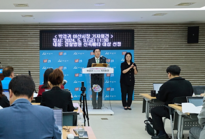박 시장은 이날 시청 중회의실에서 기자회견을 열고 “아산 경찰병원 건립 사업이 지난 2일 기획재정부의 ‘2024년 제3차 재정사업평가위원회’를 통과해 신속예타 사업으로 선정됐다”며 이같이 밝혔다.